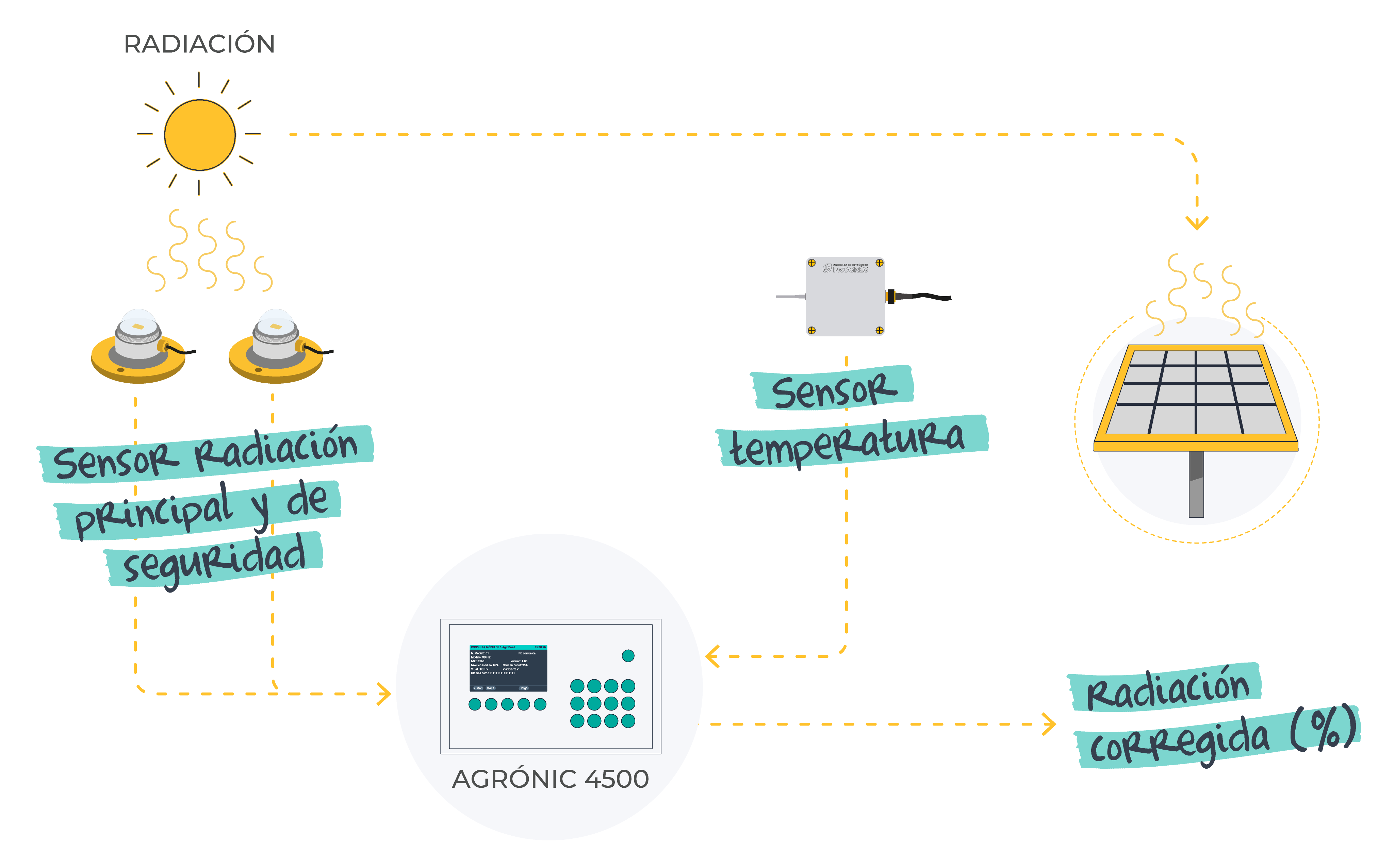 El horario solar se define de antemano, por ejemplo, de 8:00 a 18:00. Durante ese intervalo, el Agrónic 4500 analiza la radiación, la potencia de los motores y la presión de bombeo de cada sector de riego.