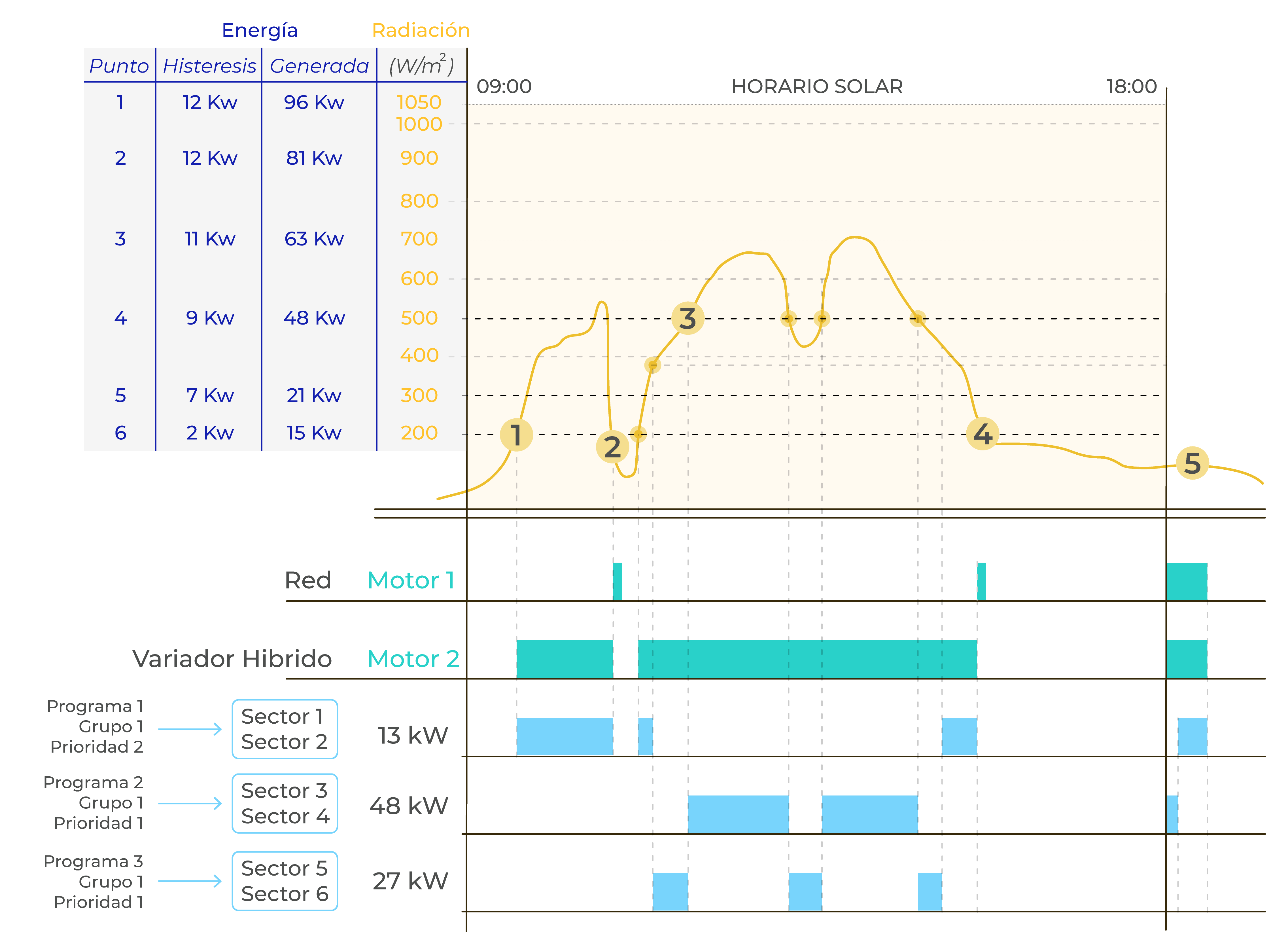 Gracias a ello, optimiza el uso de la energía solar y convencional, prioriza el funcionamiento más adecuado en cada situación y asegura la continuidad de los riegos incluso ante cambios en la disponibilidad energética o en la demanda hidráulica, manteniendo siempre la fiabilidad del sistema y el máximo aprovechamiento de los recursos.