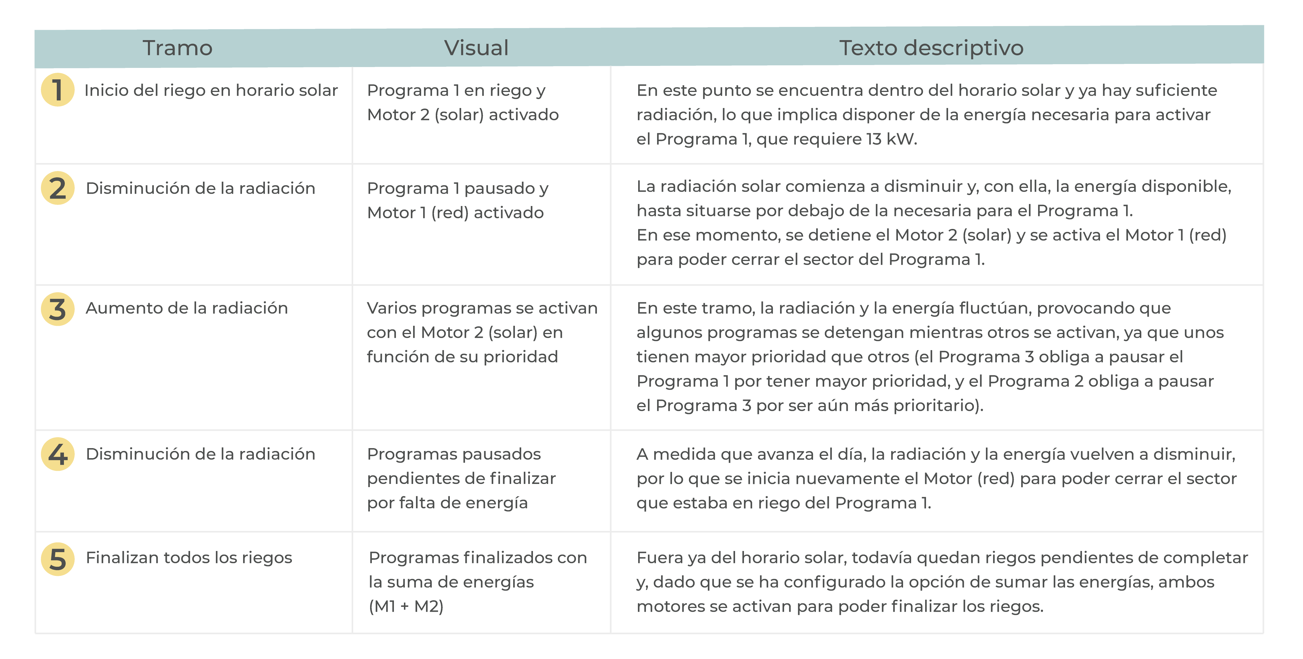 Este ejemplo detalla paso a paso cómo el Agrónic 4500 gestiona un riego mediante su función de Riego Solar Híbrido, combinando la energía procedente de los paneles solares (Motor 2) con la de la red eléctrica o diésel (Motor 1) fuera del horario solar. En cada tramo se puede observar cómo, de acuerdo con la radiación disponible y la prioridad asignada a cada programa, el controlador decide cuándo iniciar, pausar o reanudar los riegos. Además, cuando resulta necesario, el sistema combina ambas fuentes de energía para asegurar la finalización del riego incluso fuera del horario solar.