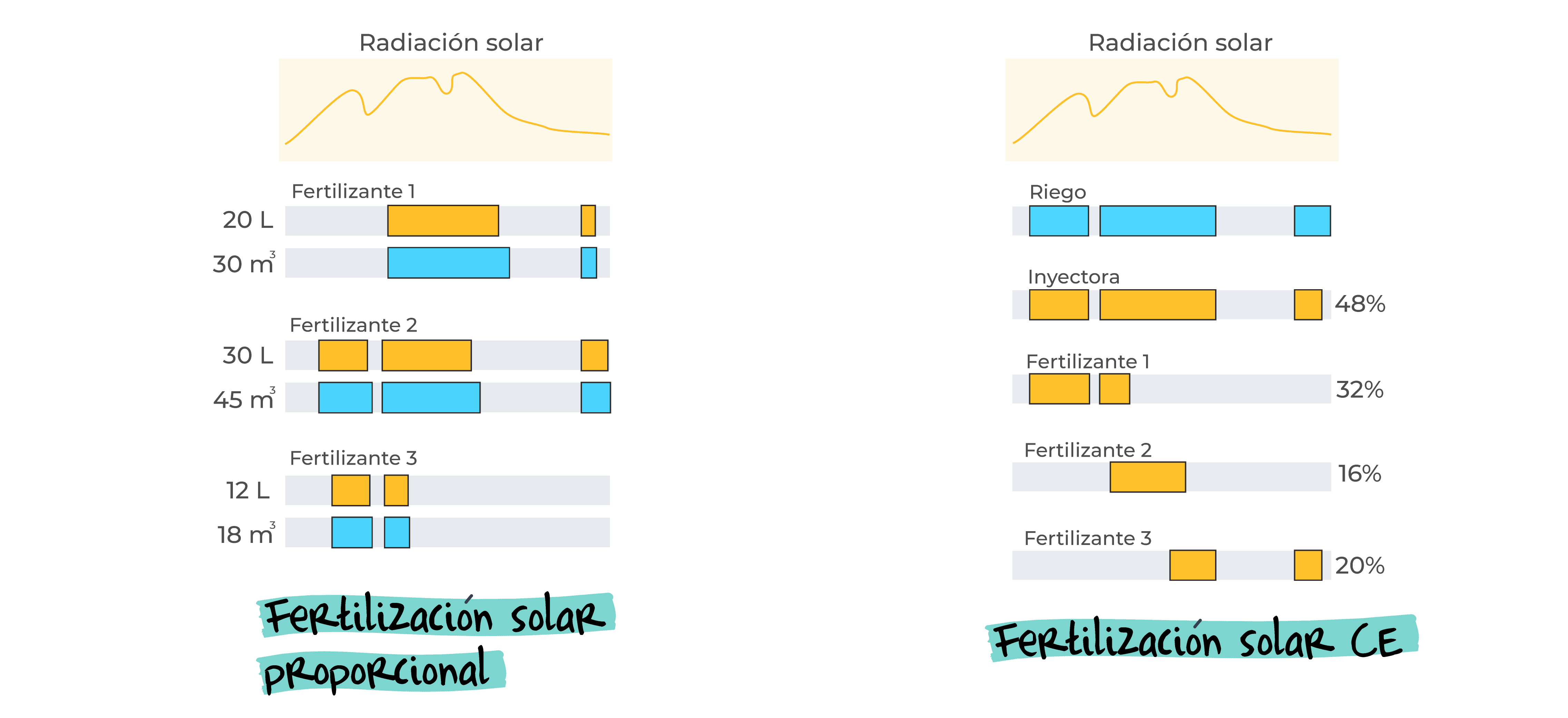 - Solo se puede ejecutar un programa a la vez con fertilización convencional (serie o paralelo), perdiendo la ventaja de múltiples programas solares simultáneos.